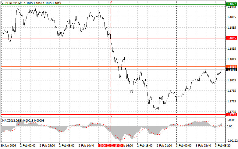 Разбор сделок и советы по торговле европейской валютойТест цены 1.1845 пришелся на момент, когда индикатор MACD много прошел вниз от нулевой отметки, что ограничило нисходящий потенциал пары. По этой причине я не продавал евро.Всплеск покупательской активности доллара был вызван вчерашней позитивной статистикой индекса ISM в производственном секторе, который превысил пороговое значение в 50. Это было интерпретировано участниками рынка как предвестие потенциального оздоровления экономики. Однако дальнейшая динамика пары будет определяться поступающими данными по еврозоне и заявлениями представителей ФРС, что делает ситуацию